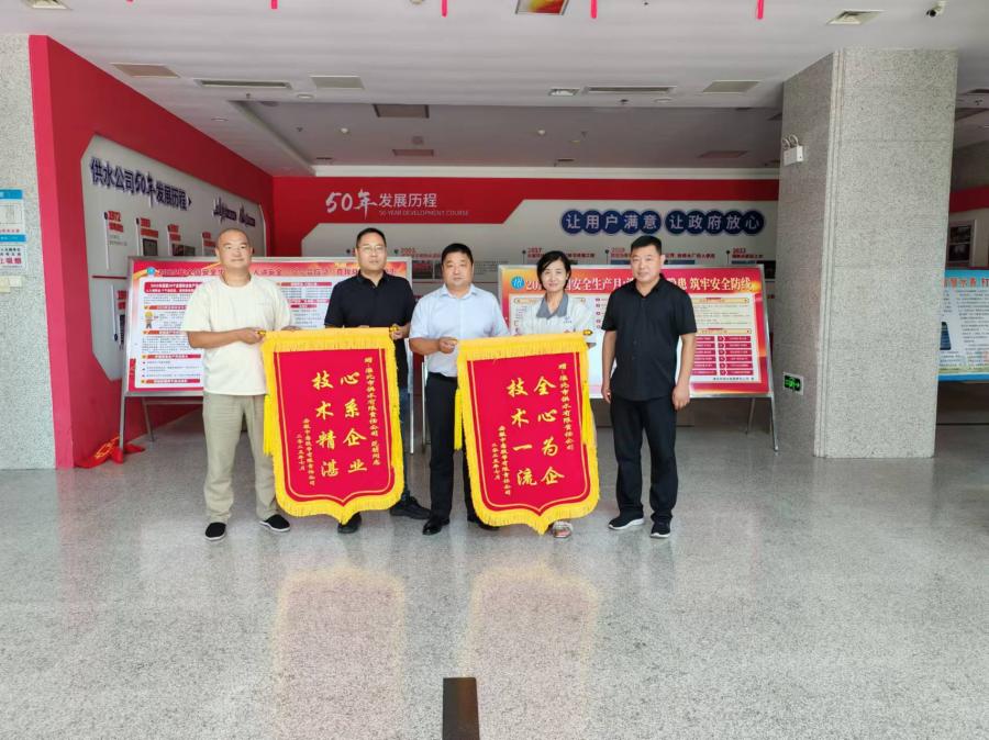 為表達(dá)謝意,7月18日上午,該企業(yè)專程來(lái)到供水公司贈(zèng)送了“心系企業(yè)技術(shù)精湛”、“全心為企技術(shù)一流”兩面錦旗。對(duì)高溫下的供水人高效專業(yè)的服務(wù)和盡心敬業(yè)的精神給予高度評(píng)價(jià)。